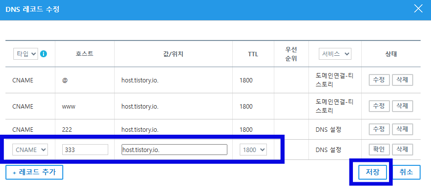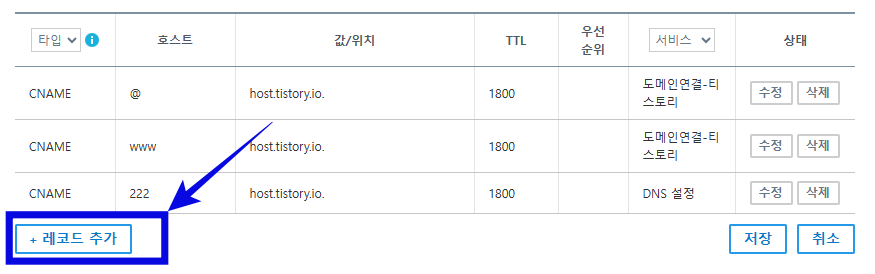 - 값/위치: host.tistory.io. (위에 내용 복사해서 붙여넣기)