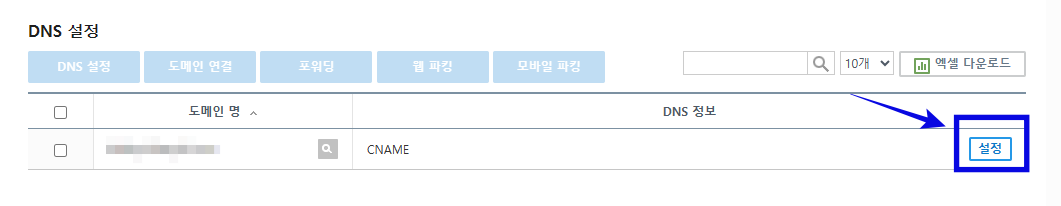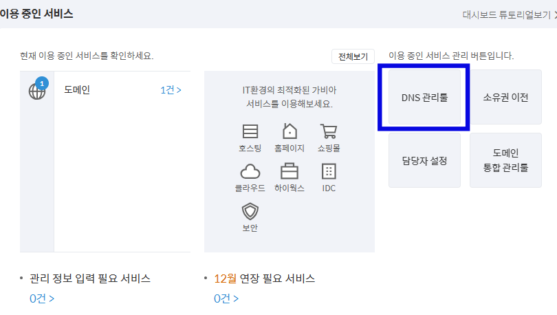 이용중인 서비스에서 DNS 관리툴을 선택한 후, 이용중인 도메인의 설정을 클릭합니다.