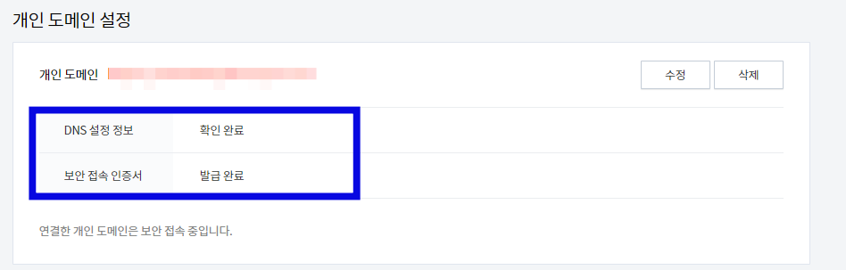 개인 도메인은 방금 만들어둔 도메인 333.myblog.como 넣어주시고, 변경사항 저장해주시면 완료!